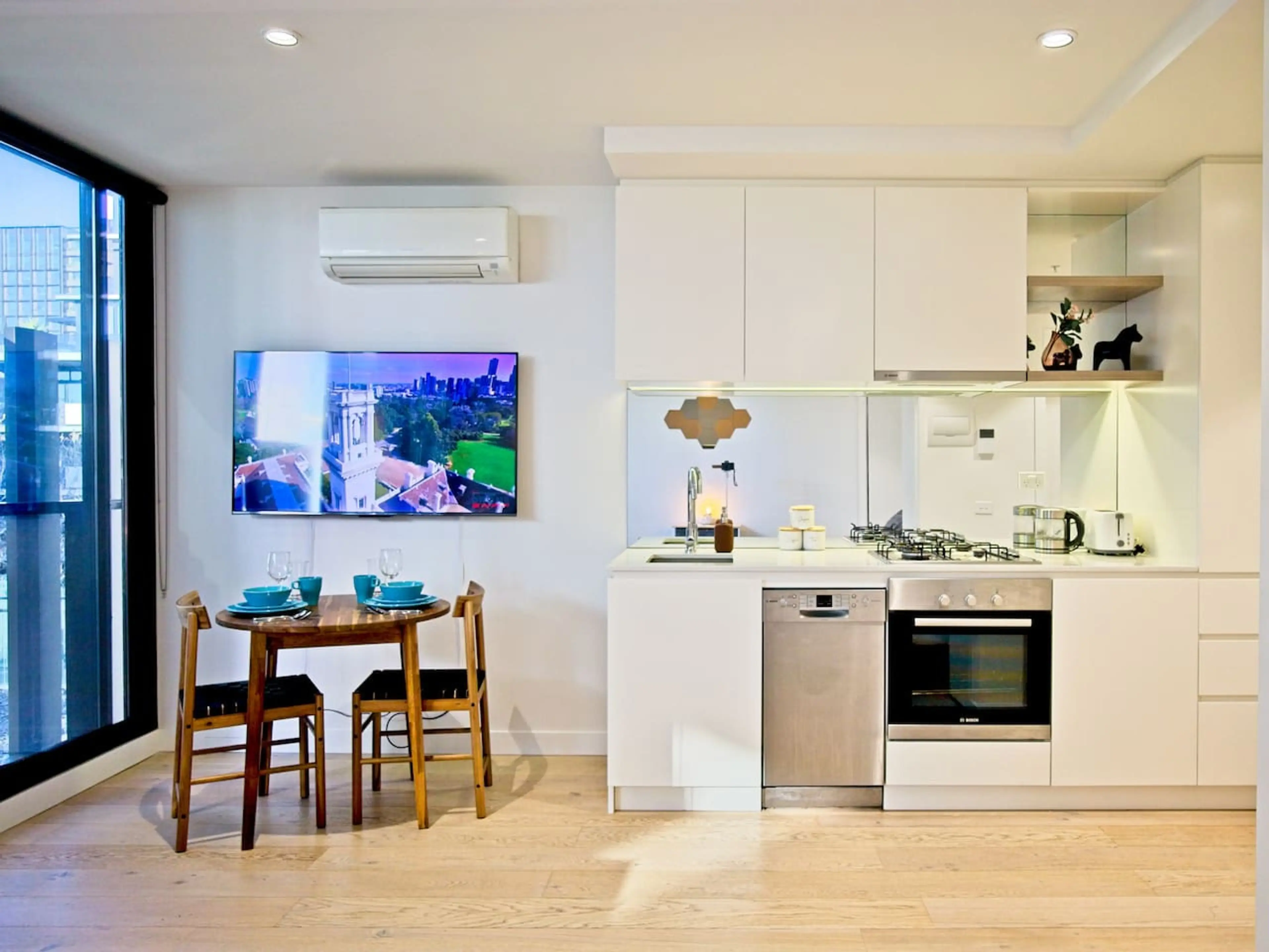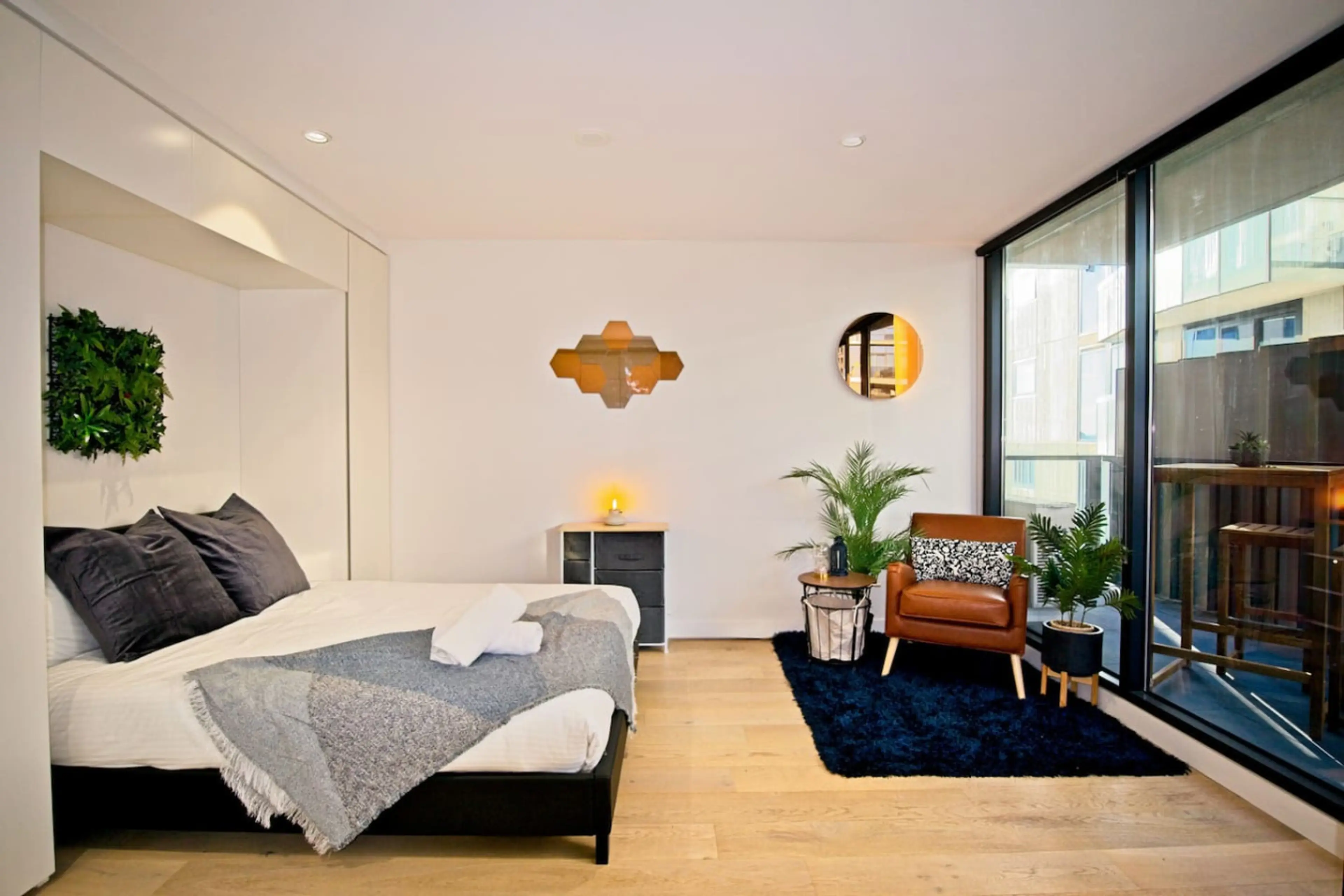 šļø Spacious studio with dark wood & leather for a vintage vibe šæ Balcony bar with fairy lights & lush greenery š Rooftop Jacuzzi with skyline view (kind pre-booking with host required*) šŗ 55" Smart TV viewable from bed & dining area š¶ Few mins walking to Queen Victoria Market, Flagstaff Gar...